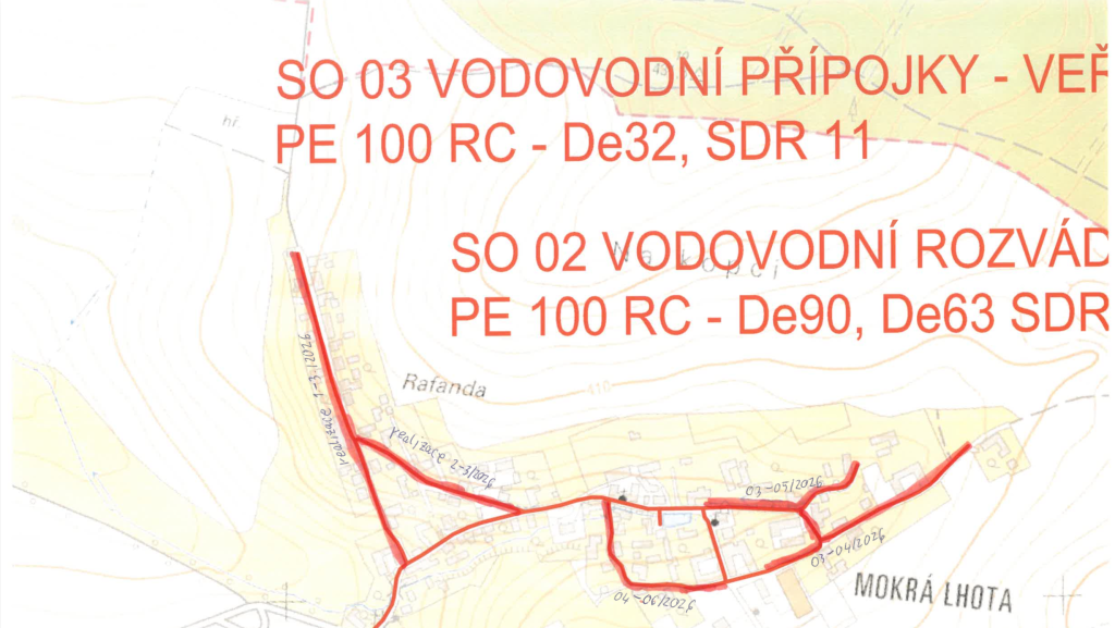 Předmětem veřejné zakázky je realizace přiváděcího řadu a rozváděcích řadů v osadě Mokrá Lhota. Navrhovaná opatření budou zajišťovat spolehlivé zásobení pitnou vodou osady Mokrá Lhota.