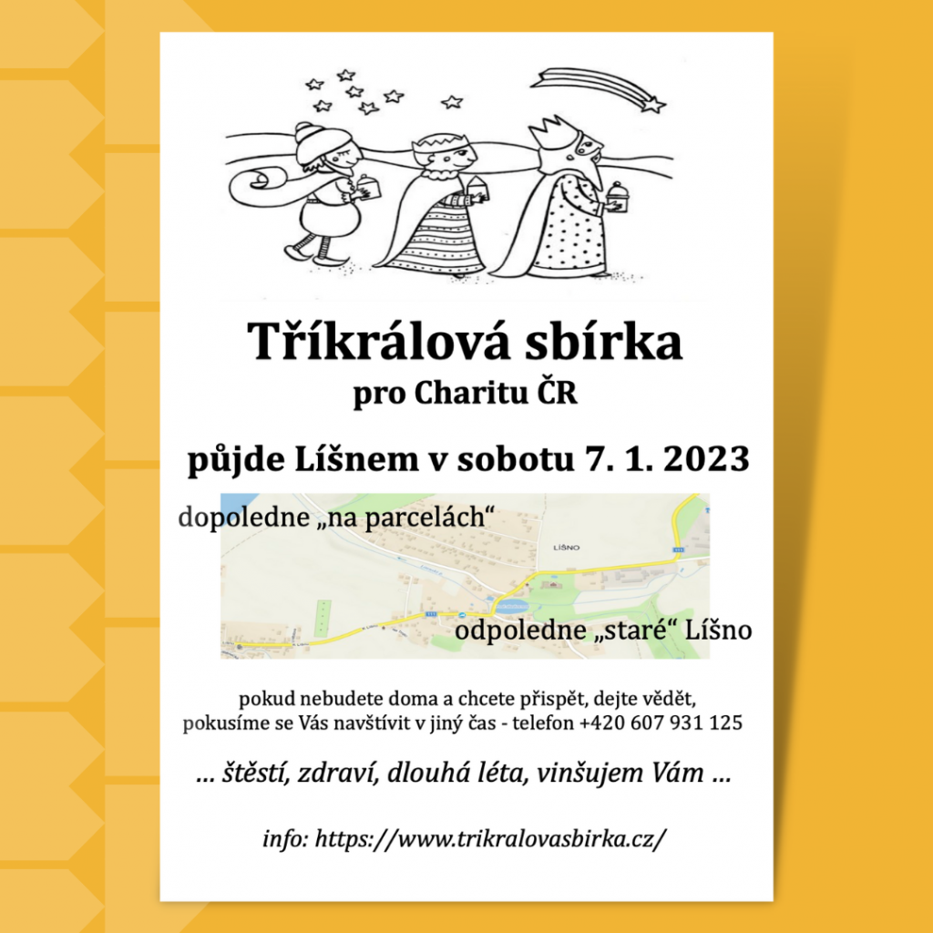 Tříkrálová sbírka pro Charitu ČR půjde Líšnem v sobotu 7. 1. 2023. Dopoledne „na parcelách“, odpoledne „staré“ Líšno. Pokud nebudete doma a chcete přispět v jiný čas, dejte vědět na tel. +420 607 931 125 (Ctirad Sedláček).