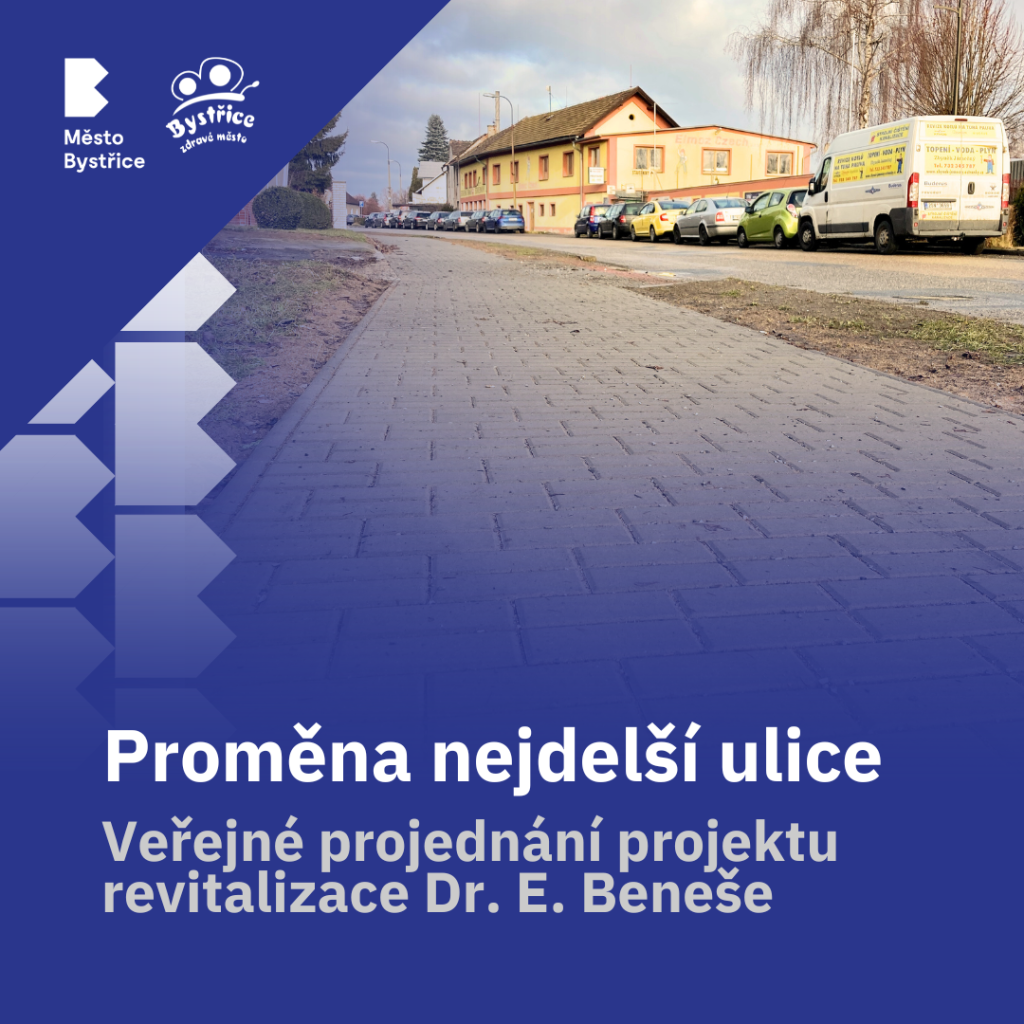 Představíme vám kompletní projekt "Revitalizace veřejných prostranství Dr. E. Beneše ve městě Bystřice". Budete mít jedinečnou příležitost vidět, jak se promění jedna z nejvýznamnějších ulic našeho města.