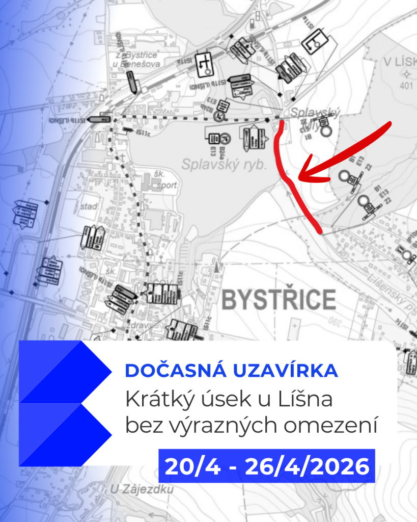 Od 20. do 26. dubna bude uzavřen krátký úsek silnice mezi Bystřicí a Líšnem (přibližně 650 metrů dlouhý úsek od křižovatky u Splavského rybníka směrem na Líšno). Objížďka povede přes Bystřici, cesta kolem Splavského rybníka zůstane průjezdná a autobusové linky pojedou bez omezení.
