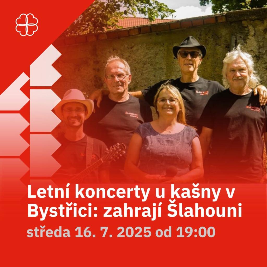 Koncert skupiny Šlahouni se dnes (středa 16. července 2025) uskuteční podle plánu od 19:00 na Ješutově náměstí – i přesto, že předpověď hlásí déšť. Přijďte si užít příjemný večer s folkovou hudbou.