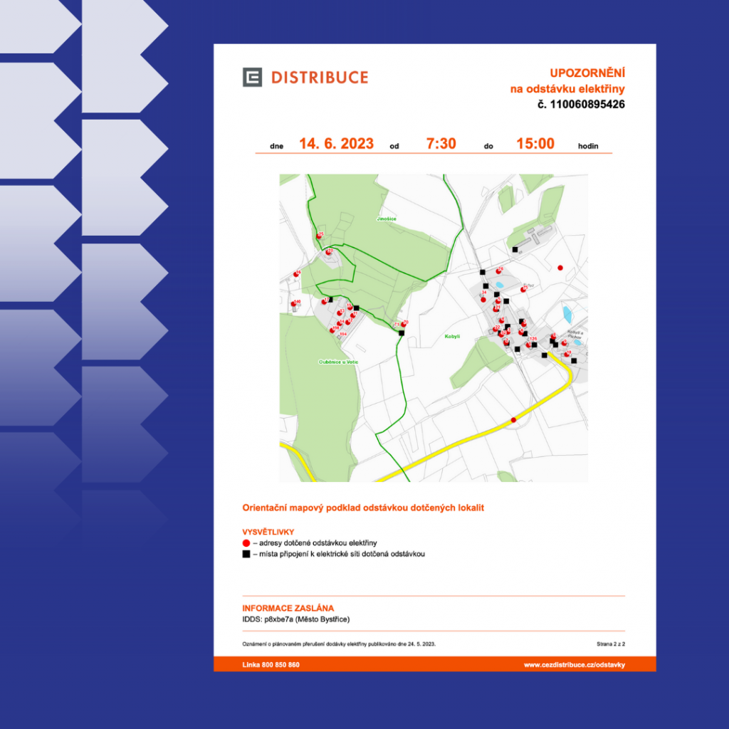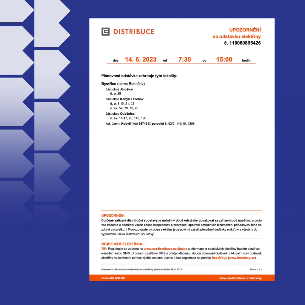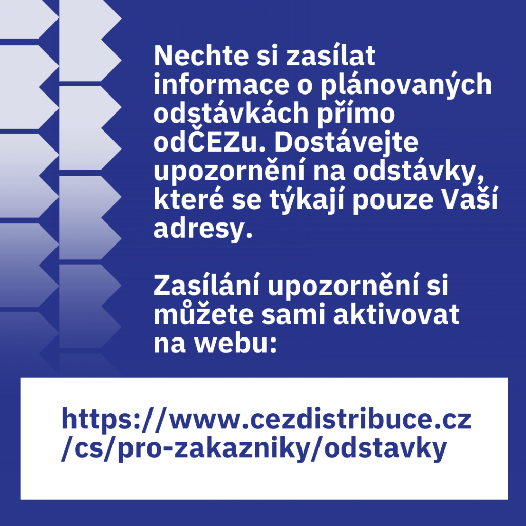 Nechte si zasílat informace od ČEZU. Plánované odstávky se zveřejňují minimálně 15 dní předem. Zasílání upozornění si můžete sami aktivovat na webu