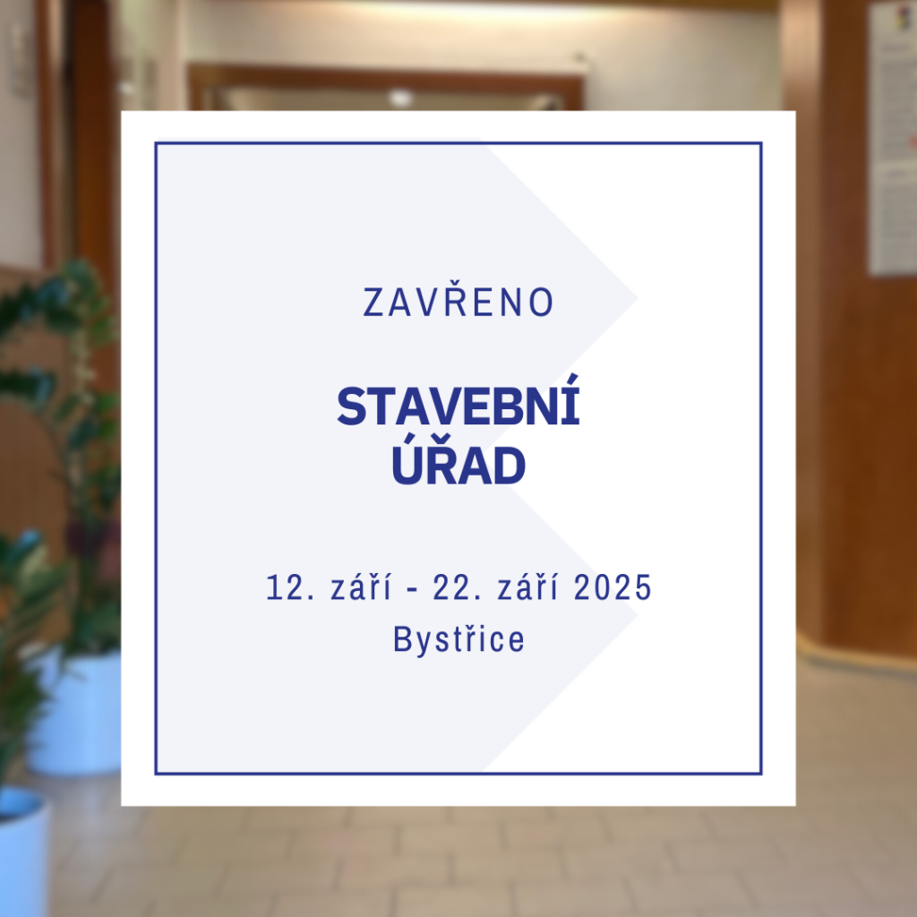 Upozorňujeme občany, že v období od 12. 9. do 22. 9. 2025 bude Stavební úřad Bystřice z důvodu čerpání řádné dovolené uzavřen. Děkujeme za pochopení.