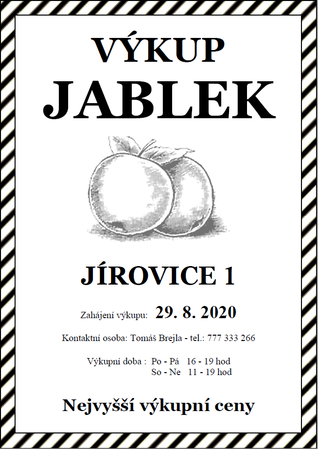V sobotu dne 29. 8. 2020 bude v Jírovicích zahájen výkup padaných jablek. Více informací naleznete v přiloženém letáčku.
