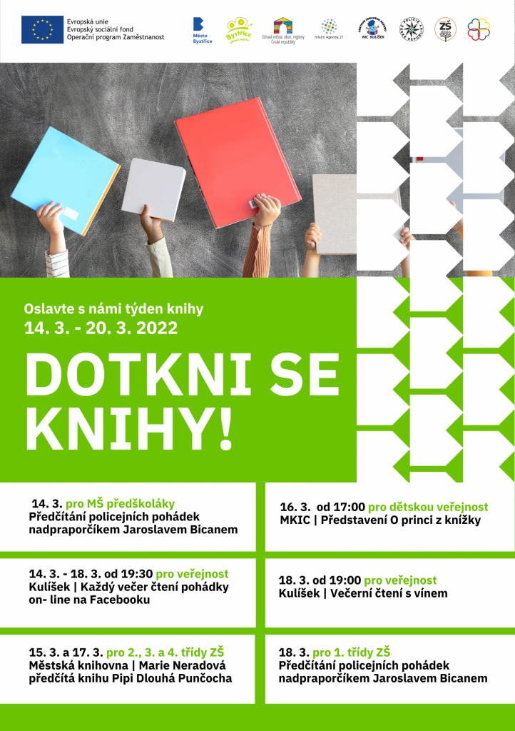 Při přípravě týdne knihy v Bystřici jsme se rozhodli, že podpoříme cíle celostátní akce projektu Březen – měsíc čtenářů. I když jsme si stanovili pro pořádání naší akce pouze jeden týden, podařilo se nám propojit síly napříč organizacemi a institucemi a připravit pestré aktivity pro téměř všechny věkové kategorie. Městská knihovna Bystřice přivítá žáky 2.,3. a 4. ročníků ZŠ Bystřice a připraví si pro své posluchače ve spolupráci s paní Marií Neradovou dobrodružné čtení z knihy Pipi Dlouhá punčocha od švédské autorky Astrid Lindgrenové. Napínavé čtení z knihy „Policejní pohádky“ přímo od nprap. Jaroslava Bicana čeká na naše nejmenší čtenáře, a to žáčky 1. tříd ZŠ Bystřice a hrdé předškoláčky z MŠ Bystřice. Láska ke knize nemusí být jen o čtení, a proto MKIC Bystřice připravilo ve svém programu dětské divadelní představení O princi z knížky, které je určeno pro širokou veřejnost. Dnešní doba si žádá mnoho inovací a tohoto nelehkého úkolu se báječně zhostilo MC Kulíšek. Rádi se pohybujete v on-line prostředí? Ano? Tak to je informace právě pro vás. Kulíšek bude celý týden číst pohádky on-line. Stačí se jen připojit. A na Vás, kdo má rád klidný večer s knihou čeká v MC Kulíšek večerní čtení s vínem.